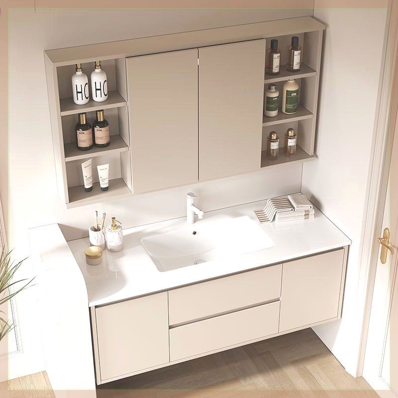小さなクリームホワイトの肌の感触のハニカムアルミニウムバスルームキャビネットセラミック一体型洗面台手洗い洗面台