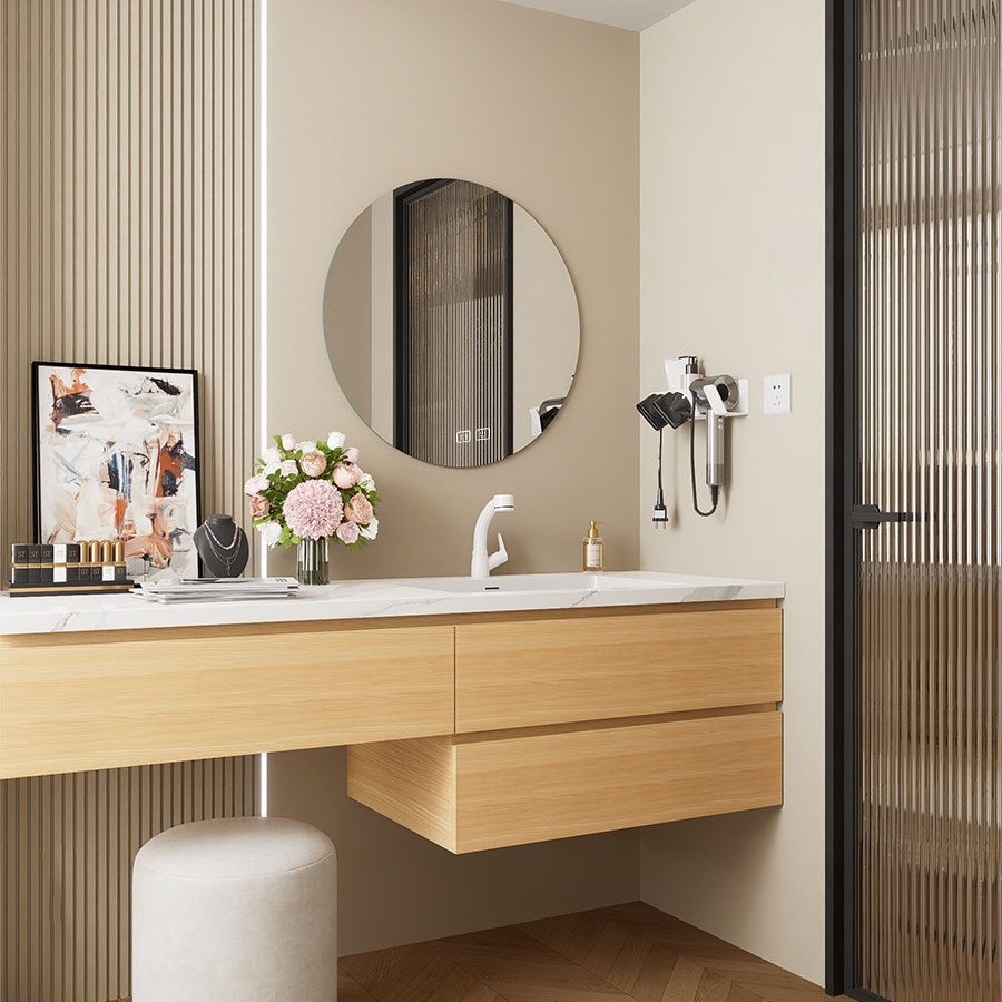 特別なバスルームキャビネット組み合わせセラミック一体型無垢材木目調バスルームシンク軽量手洗い洗面台キャビネット
