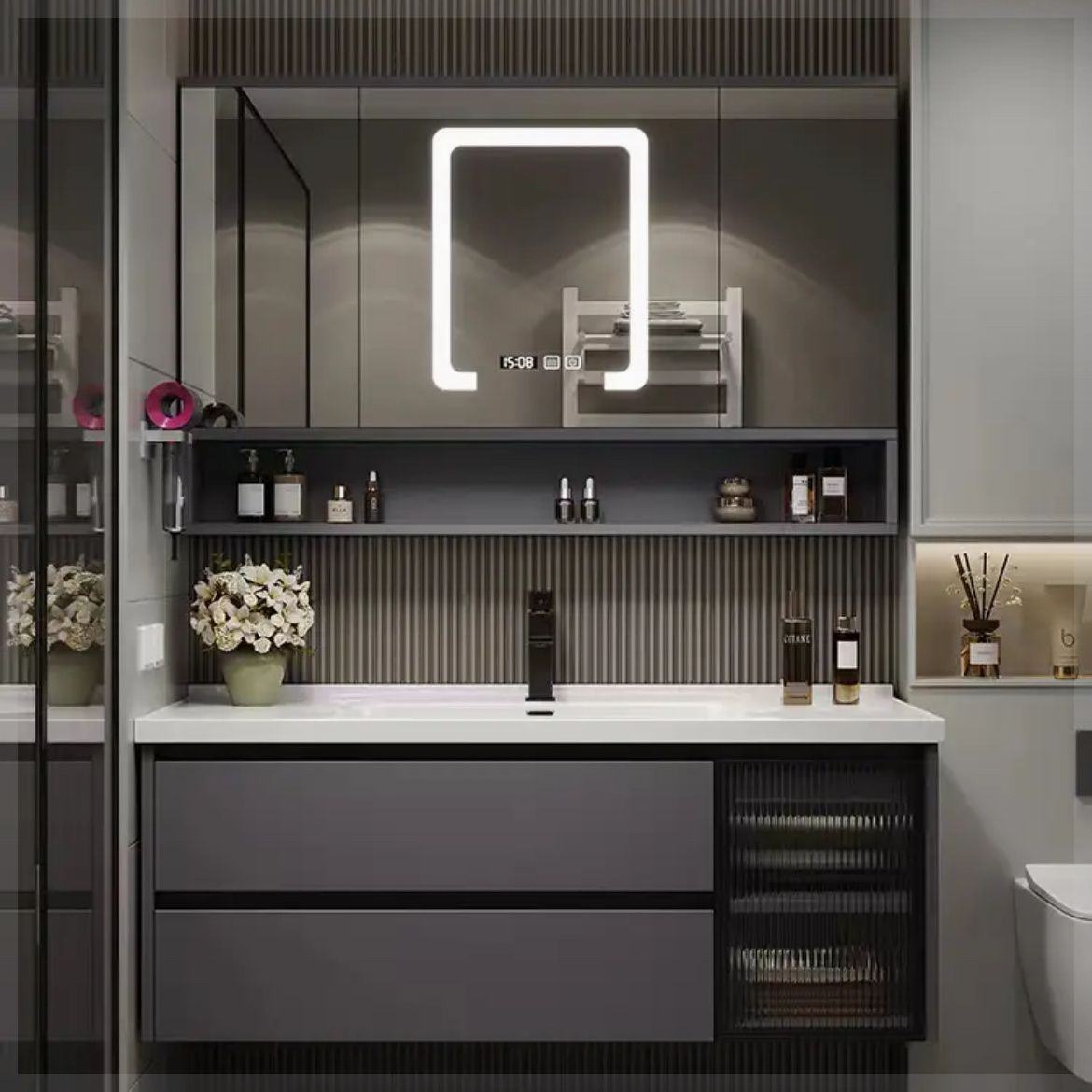 宇宙アルミ浴室キャビネットセットトイレセラミック洗面器スマート鏡キャビネット厚い洗面器壁掛け洗面台
