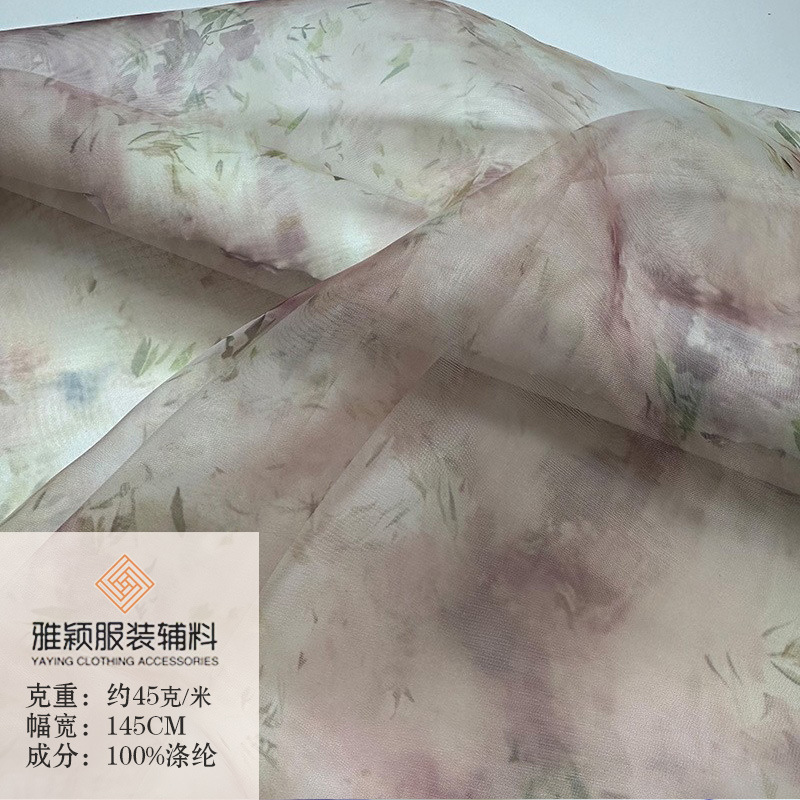 暗号化糸 20D スーパーソフトオーガンザプリント生地超薄型妖精ヘイジーピンク花柄ドレス生地