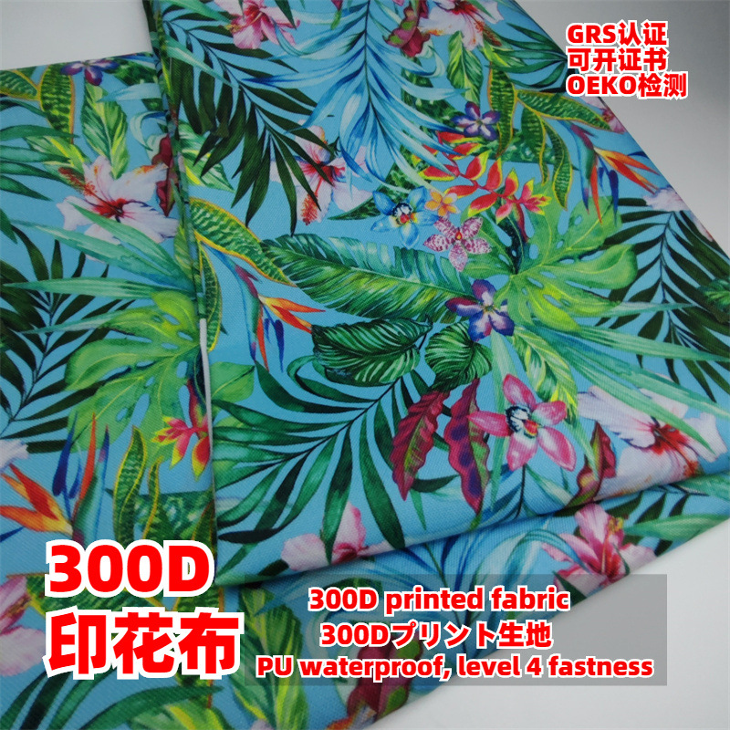 大量供給grs再生欧標検査はrpet証明書ポリエステル300dpu防水プリントオックスフォード布を開くことができる
