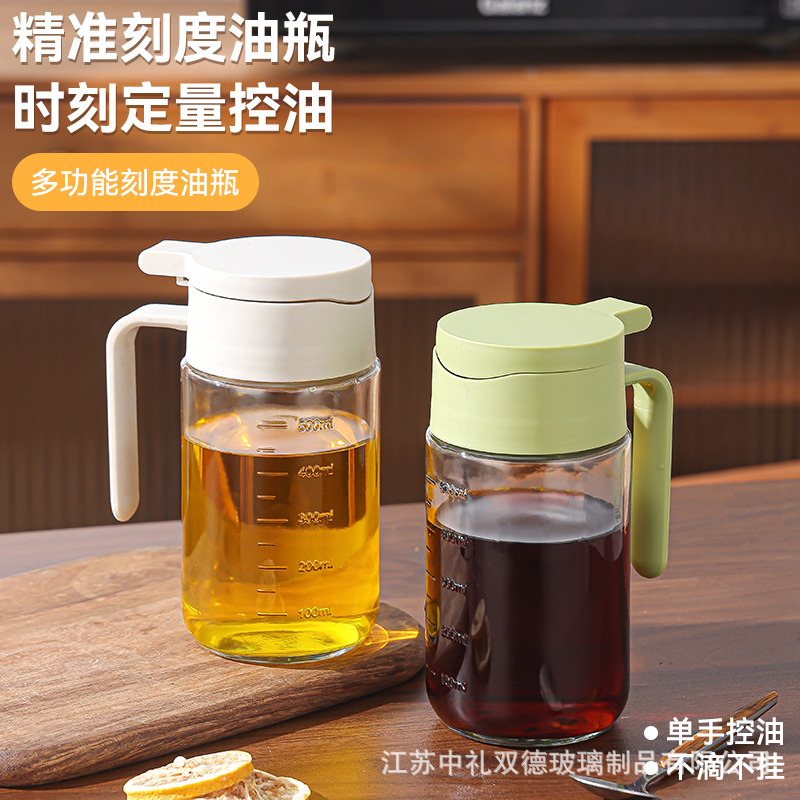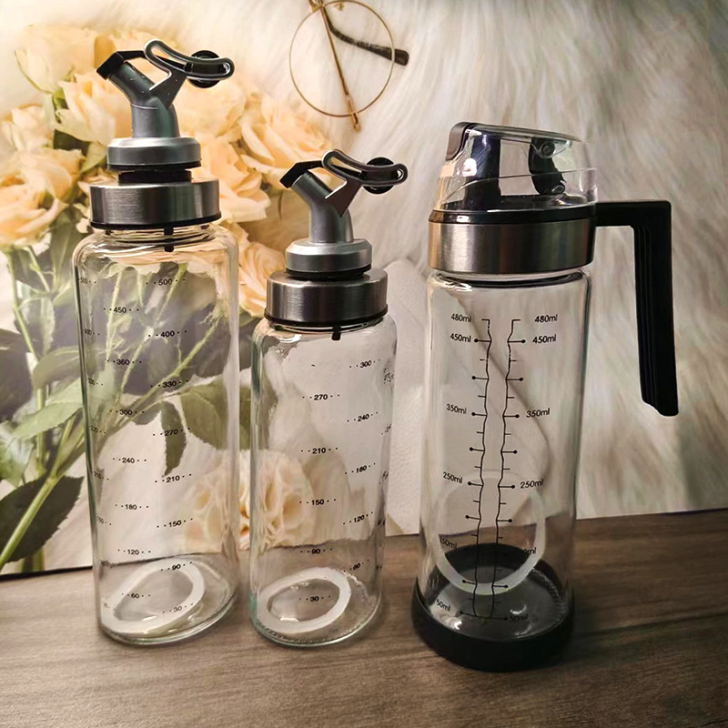 ガラス自動開閉オイルポット目盛り付き大容量オイルボトルキッチン家庭用醤油酢調味料空ボトル480ml