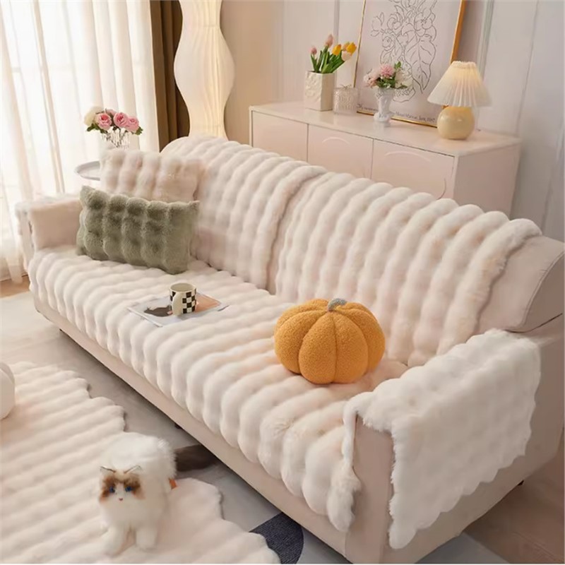 新作の防ウサギ毛皮風ソファクッション、バブルベルベット滑り止めベッドサイドカーペット、ソファカバー、猫の引っ掻き傷防止シートクッション、厚手の毛布
