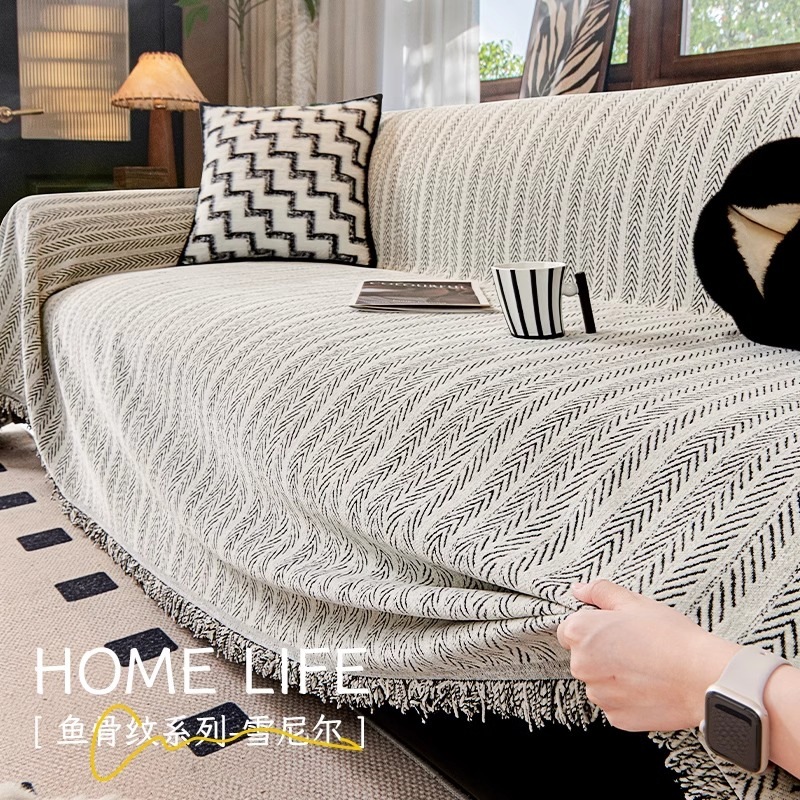 ヘリンボーン柄クリームソファクッション、オールシーズン万能ソファタオルカバー、フルカバーカバーブランケット&Y