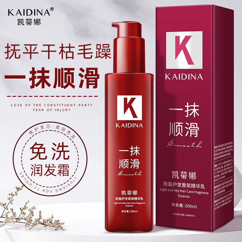 ケイティナは滑らかで持続的なアロマヘアケアのエッセンス乳液を洗っていないヘアコンディショナーで髪を整えています。
