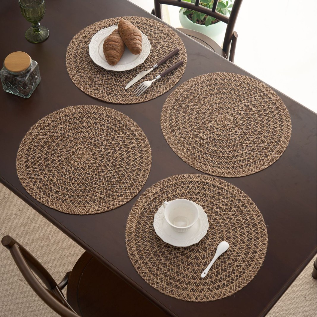アメリカンレトロリネンプレースマット織りメッシュ小さな中空麻ロープ装飾多用途コーヒー色断熱プレースマットラウンド