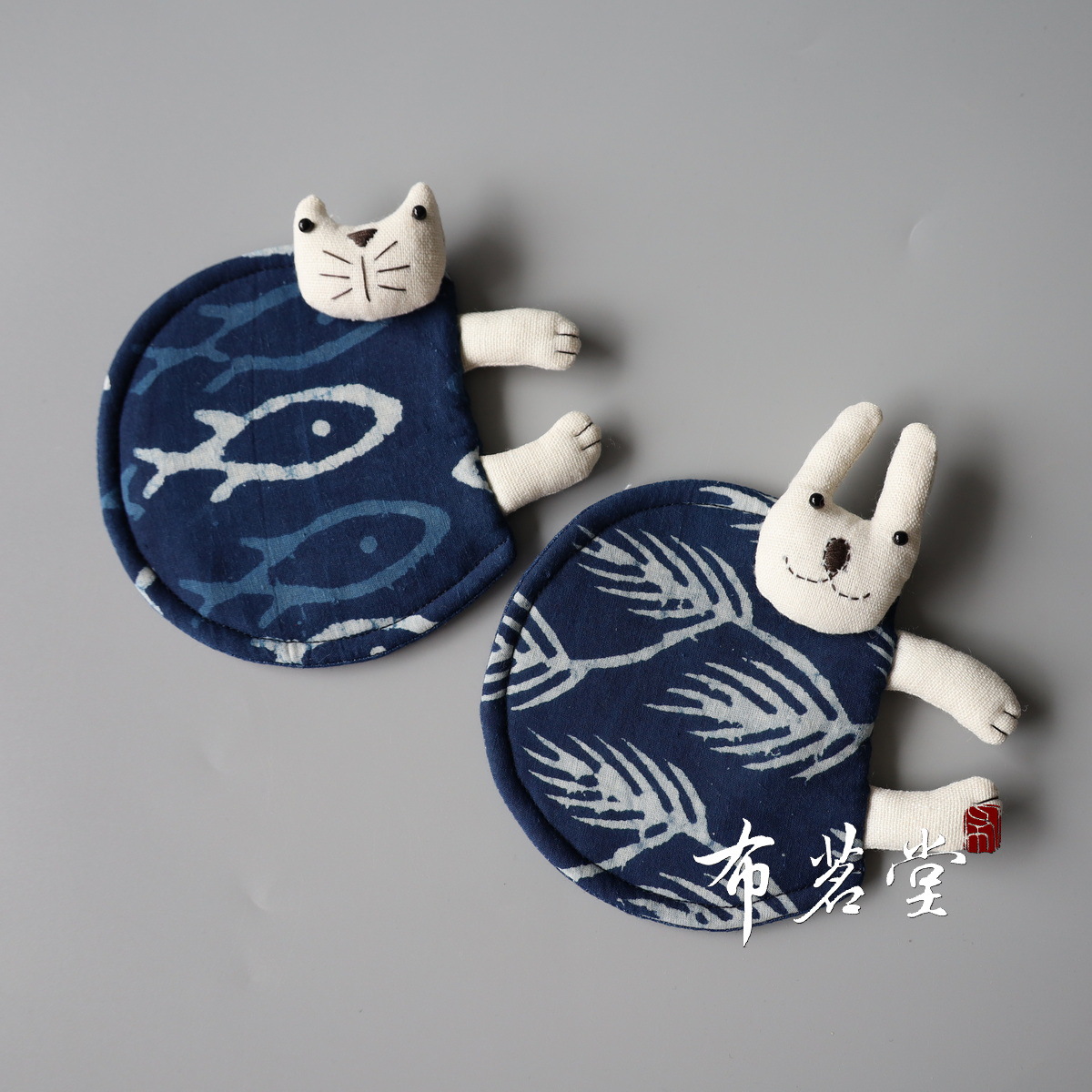 布茗堂手作り捺染子猫ウサギカップマット手作り染色植物青染純綿材質