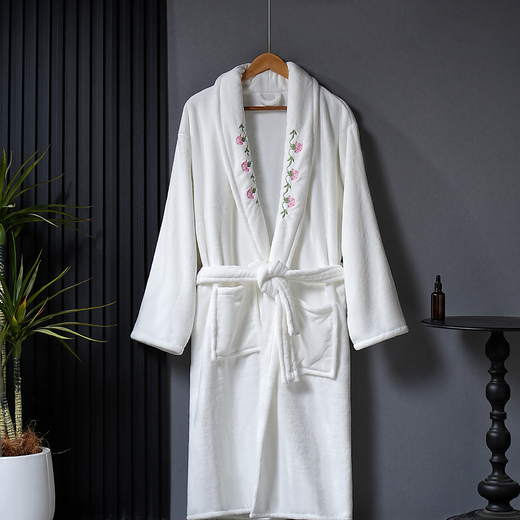 シンプルなホテルのバスローブはロゴを刺繍でき、厚く長く、快適で吸水性のあるカットベルベットの温泉ホームホテルのバスローブです。