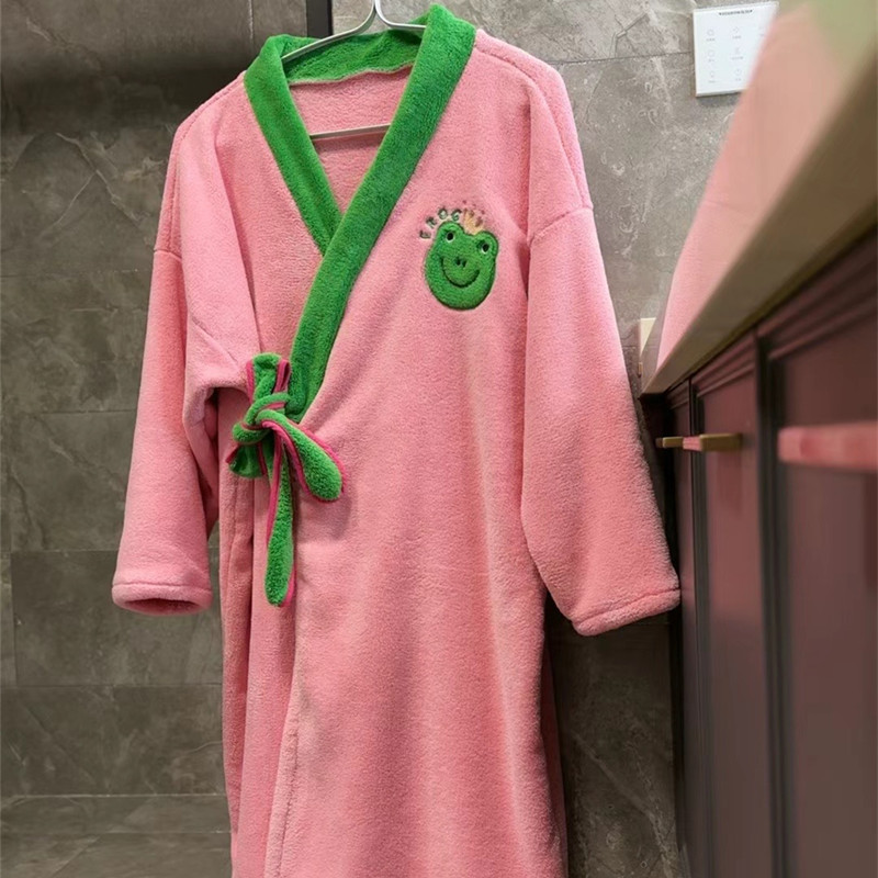 新しいサンゴの毛のバスローブの家の服のパジャマのカエルは色の漫画のかわいいパジャマの秋冬の家の服の厚い長さにぶつかります。