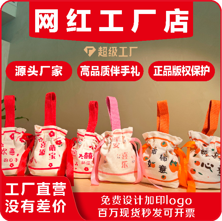 メーカーの卸売りのお土産の現物の手提げのキャンバスの袋の小さい福袋の喜糖の袋はプリントの図案のlogoの束のポケットをプラスします。