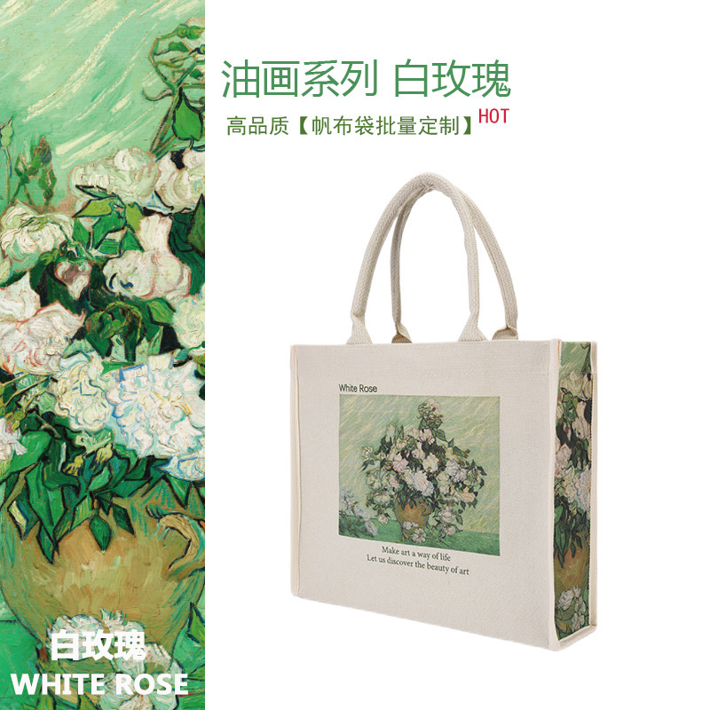 ゴッホの白いバラのキャンバスバッグの油絵の大容量のトートバッグの女子学生の通勤の卸売りの手提げのキャンバスバッグはオーダーメイドします。