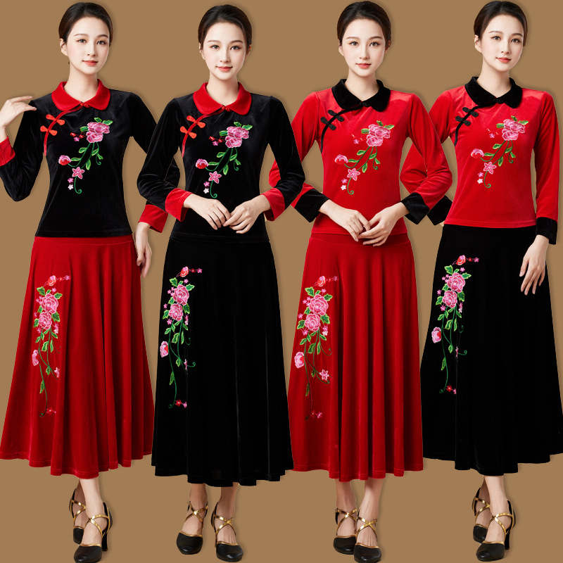 秋冬広場ダンス服刺繍金ベルベット中国民族風ダンス中高年団体表演出服セット