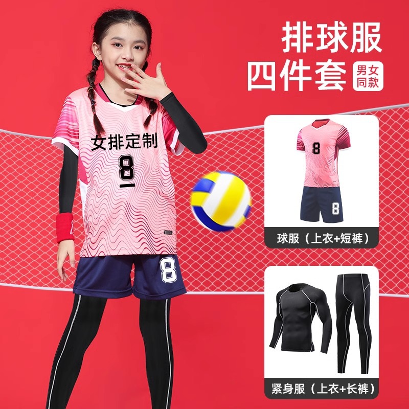 ピンクの子供バレーボール服4点セットの女の子男の子試合運動ユニフォーム学生バドミントンサッカー縄跳び服