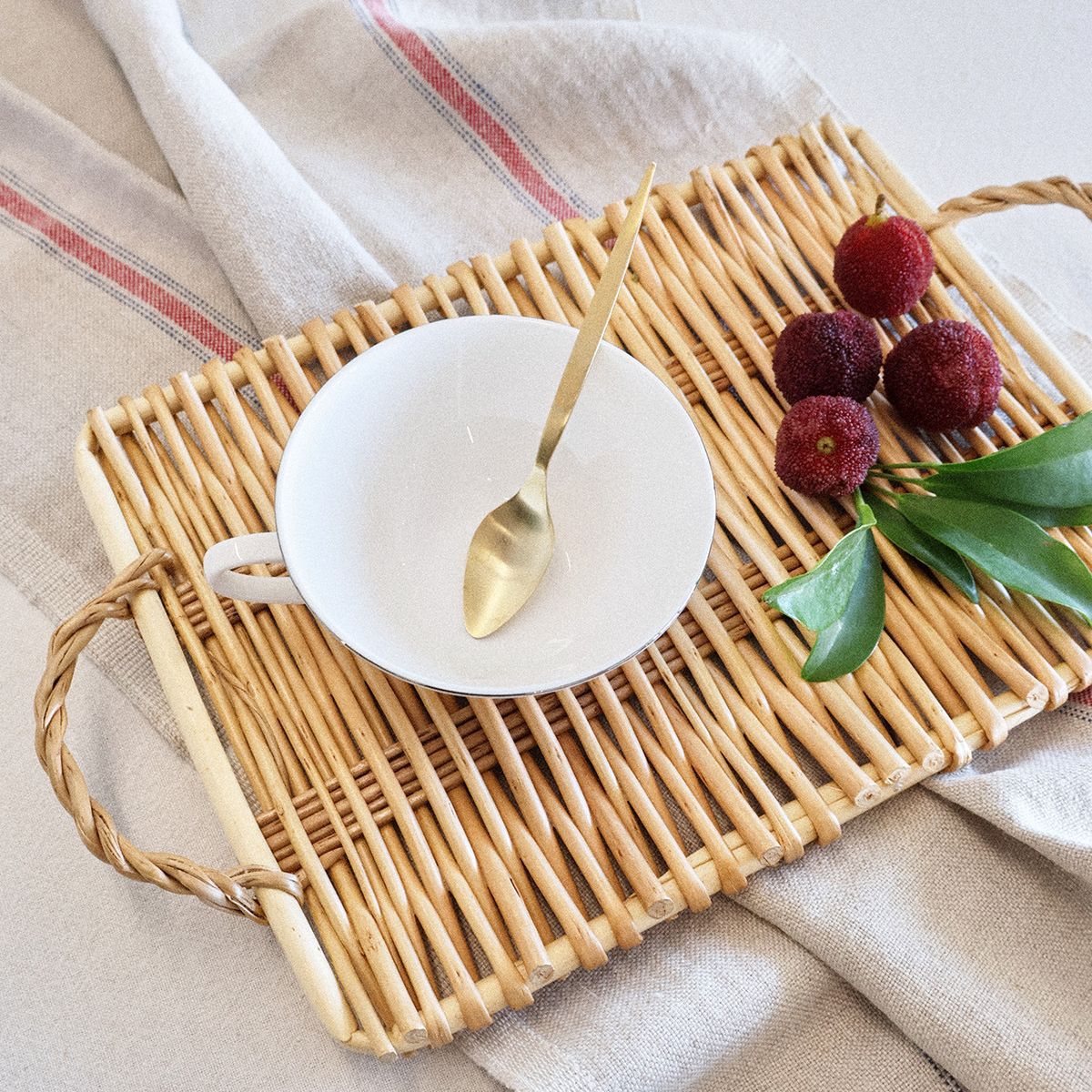 籐製フルーツトレイ 編み込みハンドル付き収納トレイ 和風お菓子トレイ 両耳付きドライフルーツ・スナック・パン・朝食トレイ