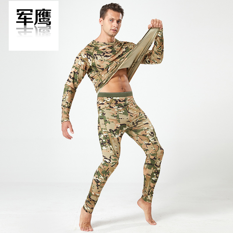 越境供給 冬用迷彩柄メンズフリース保温下着セット 肌に密着する通気性のあるアウトドア迷彩スポーツウェア