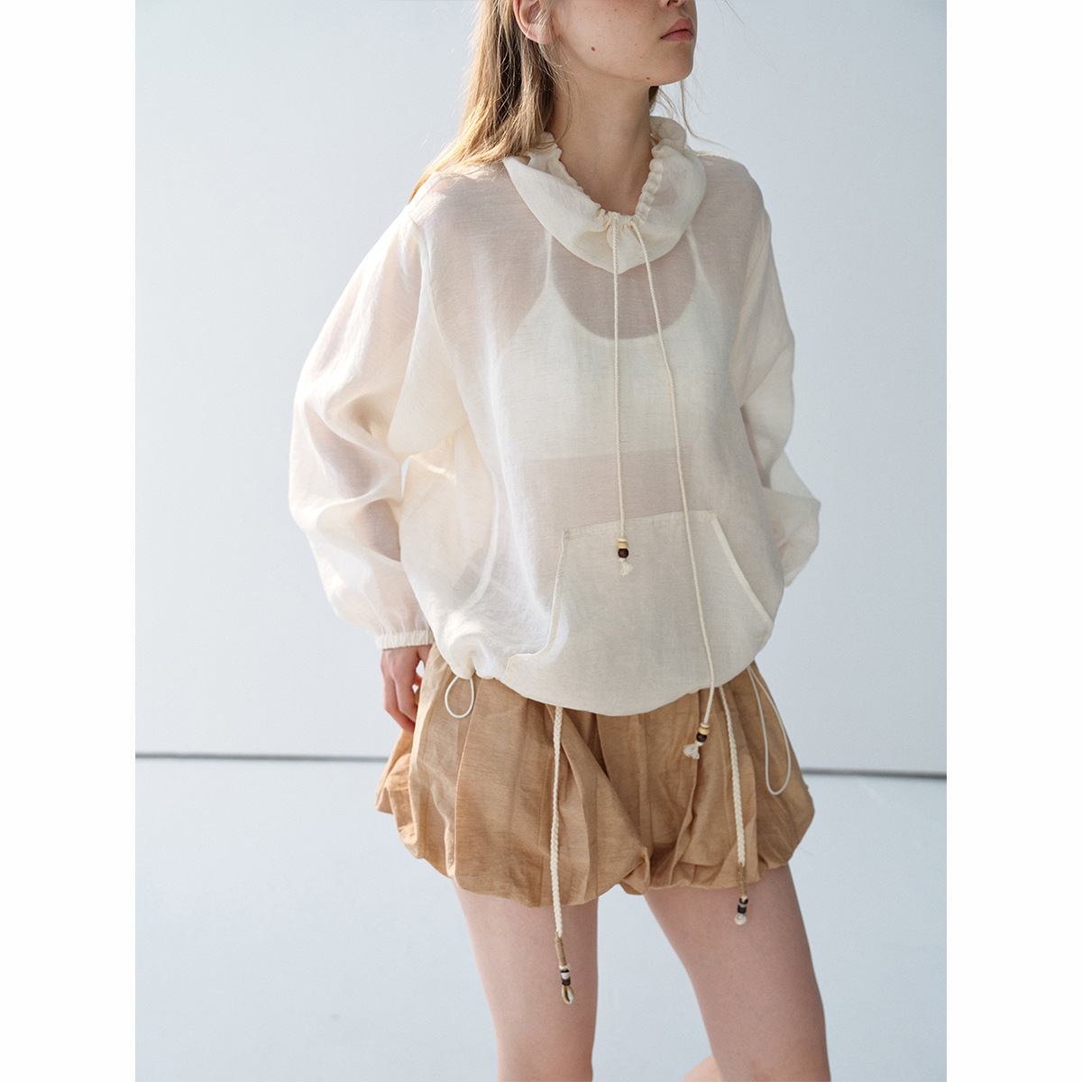 [Dahe] 夏新作カジュアルネックラインレースアップリネン半透明パッチポケット巾着パンプキンカラートップ H8940