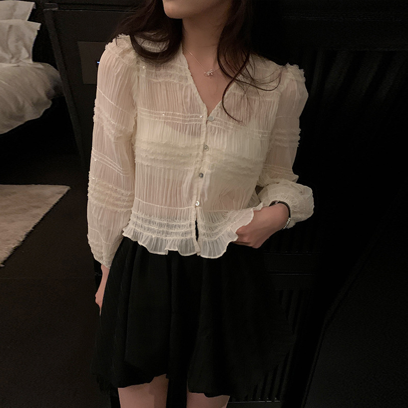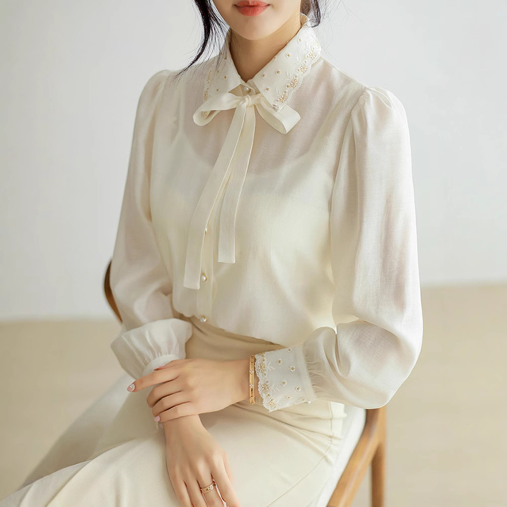 2025春シックなトップデザインフレンチニッチショートハイエンド長袖シフォンシャツ女性用春