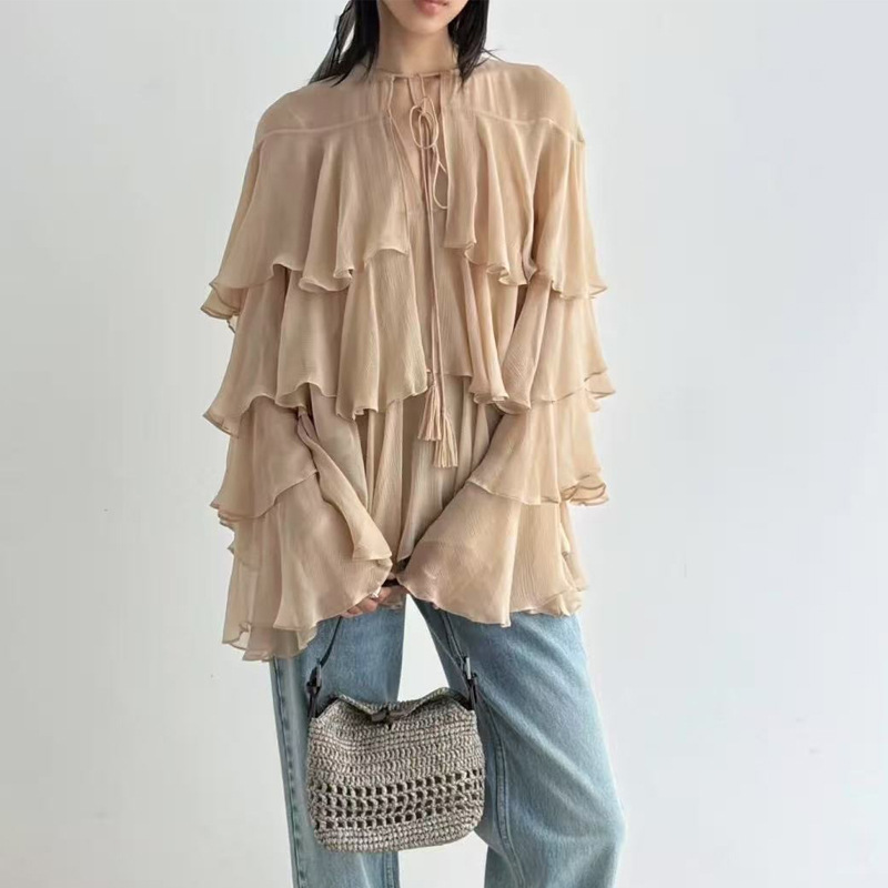 無地フリルレースアップパッチワークシャツ、クールでエレガントなシルクケーキトップ、小ロット生産加工