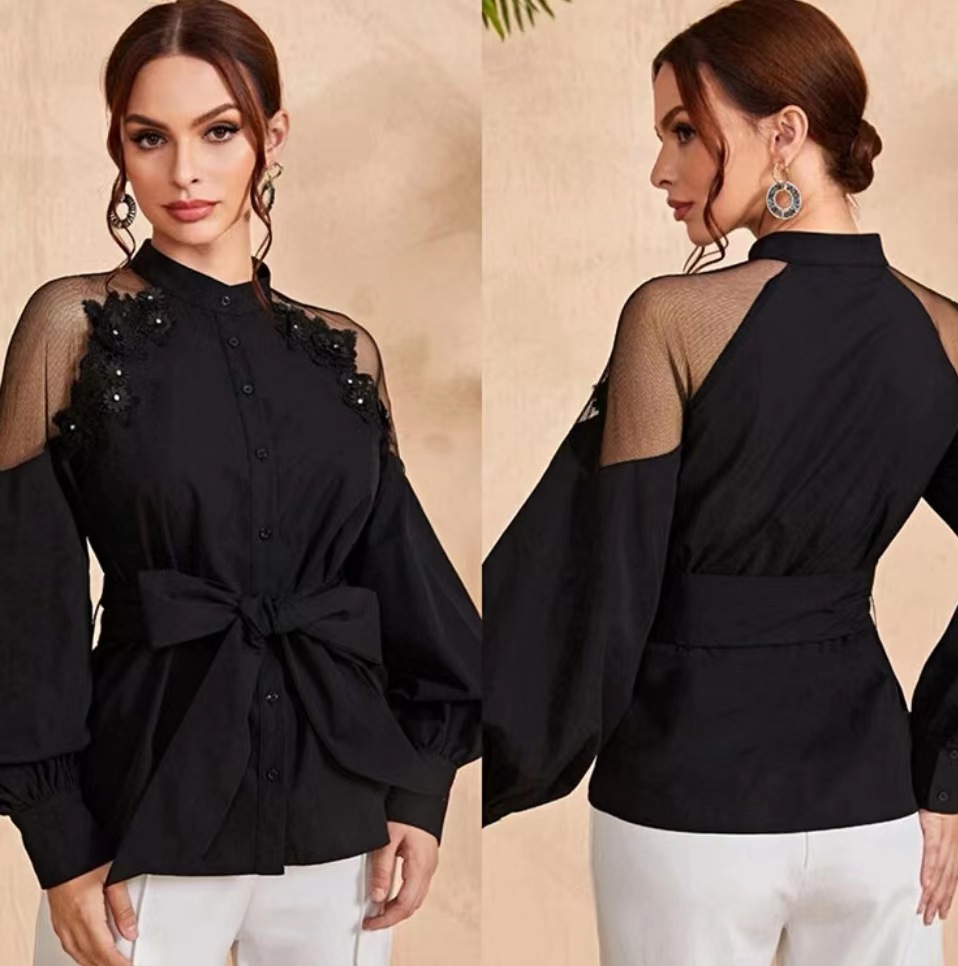 レースのシフォンのシャツ2023欧米のアマゾンの新型のセクシーな透かし彫りの袖の純色のボタンはレースの女性の上着を結び付けます。
