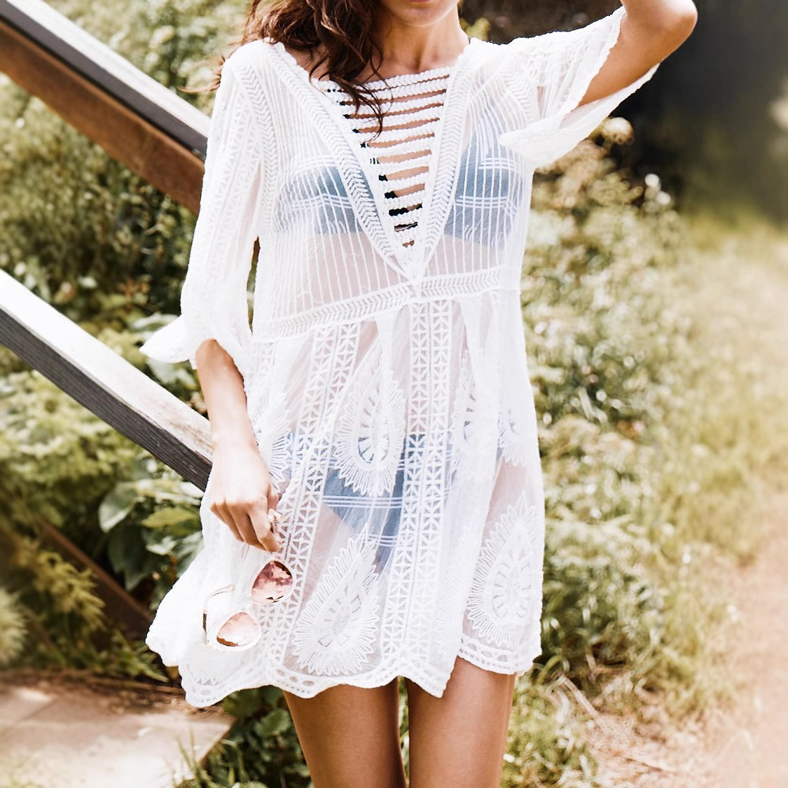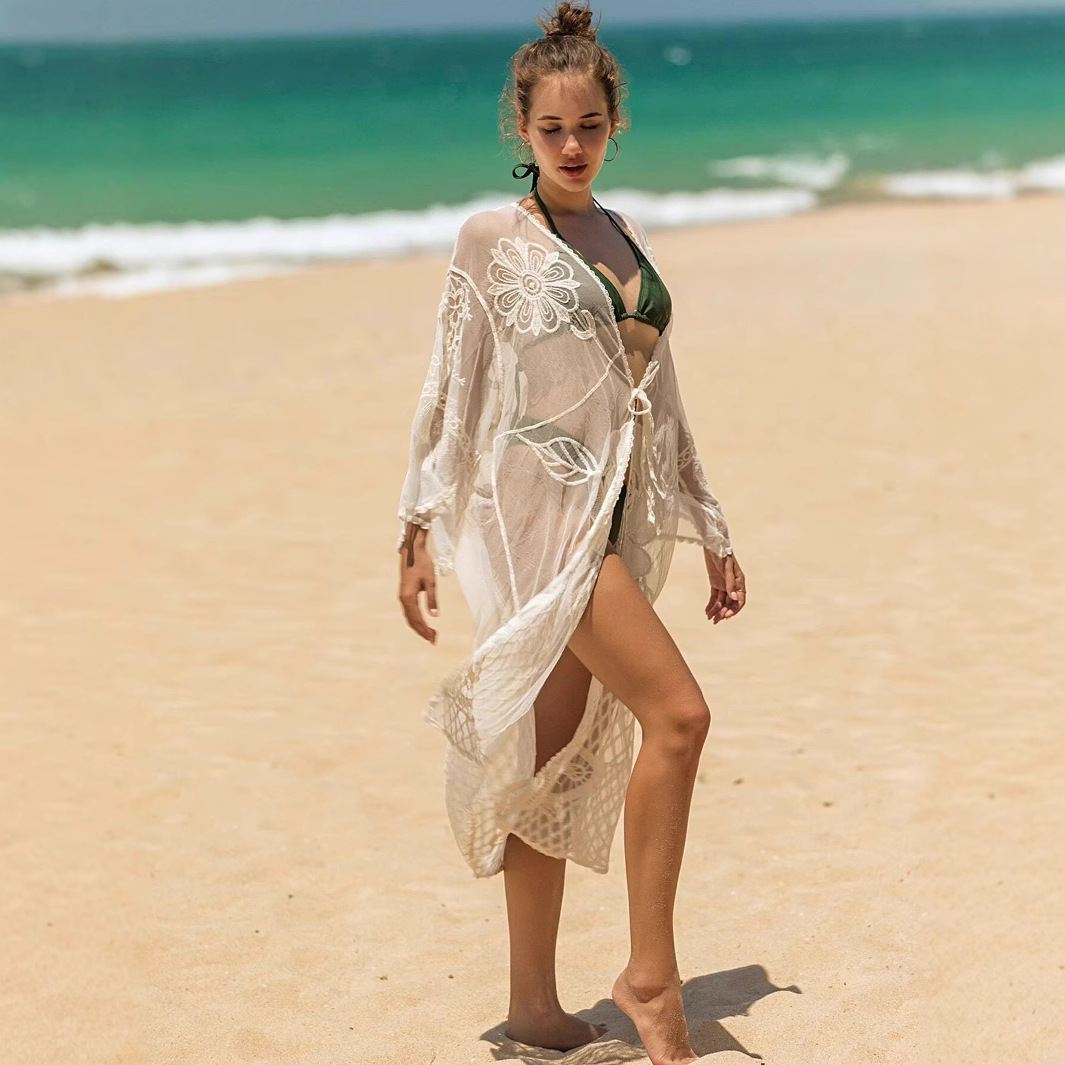 2020新品アマゾンビーチウェアレディース白いレースブラウスメッシュ刺繍水着ショールカーディガン