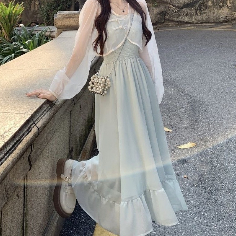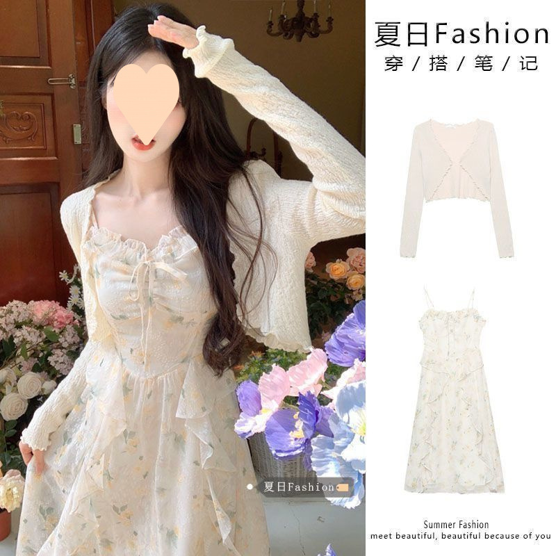 甘辛シフォンフリル花柄サスペンダードレススーツレディース夏薄手カーディガンウエストロングスカート