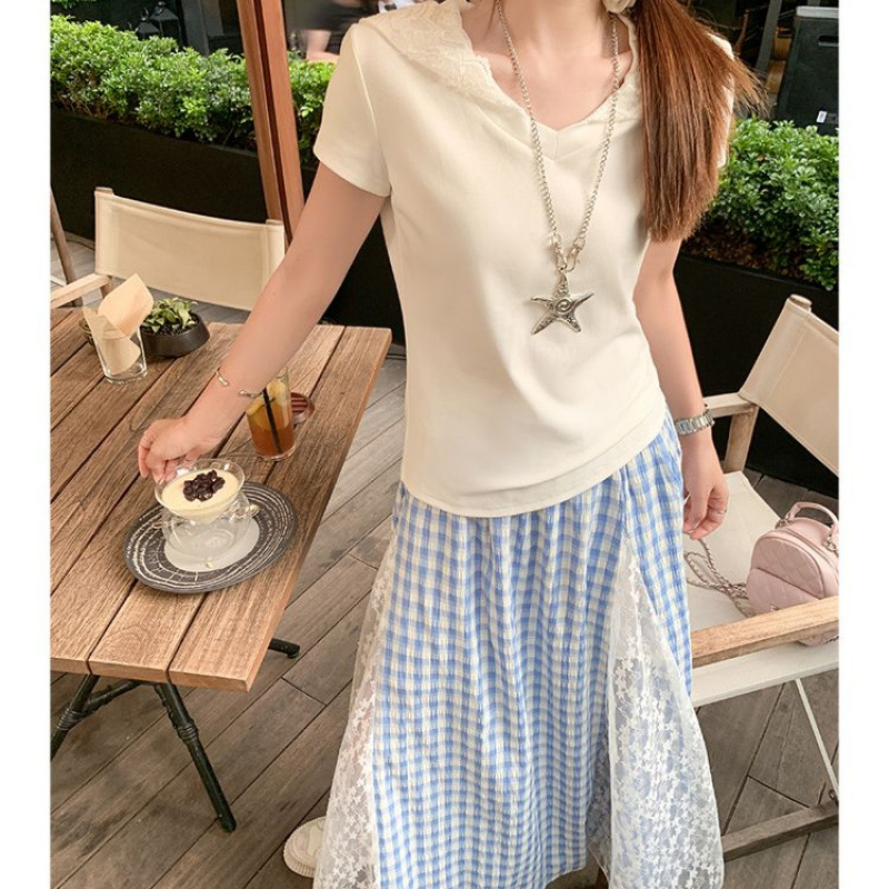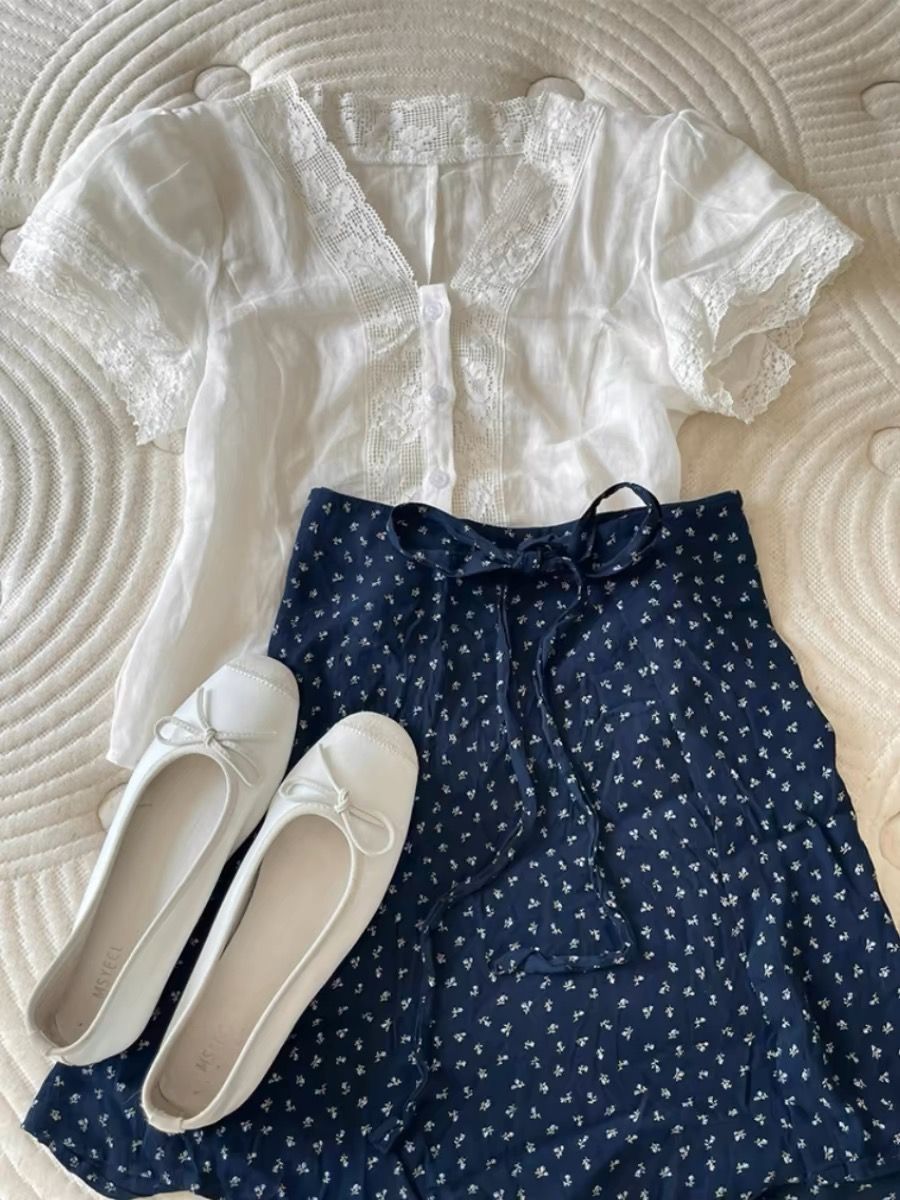 韓国の優しくて甘いVネック半袖レースシャツ夏デザインハイウエスト花柄レースアップスカートスーツ