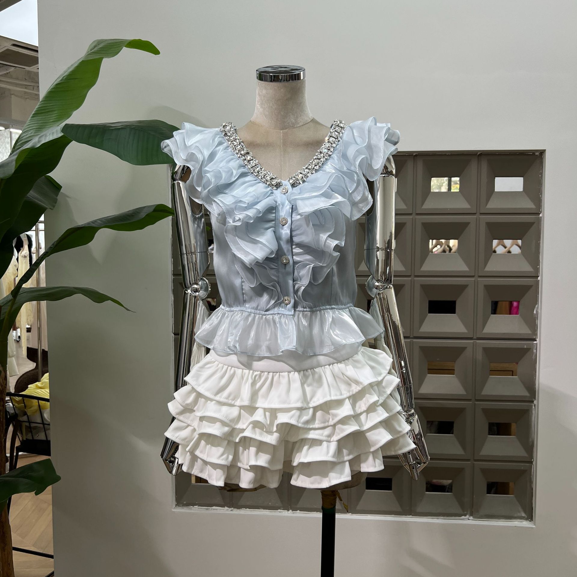 Amazon フレンチサマー 2025 スイートスタイル ダイヤモンド フリル V ネック シャツ + ケーキ スカート おしゃれでシンプル