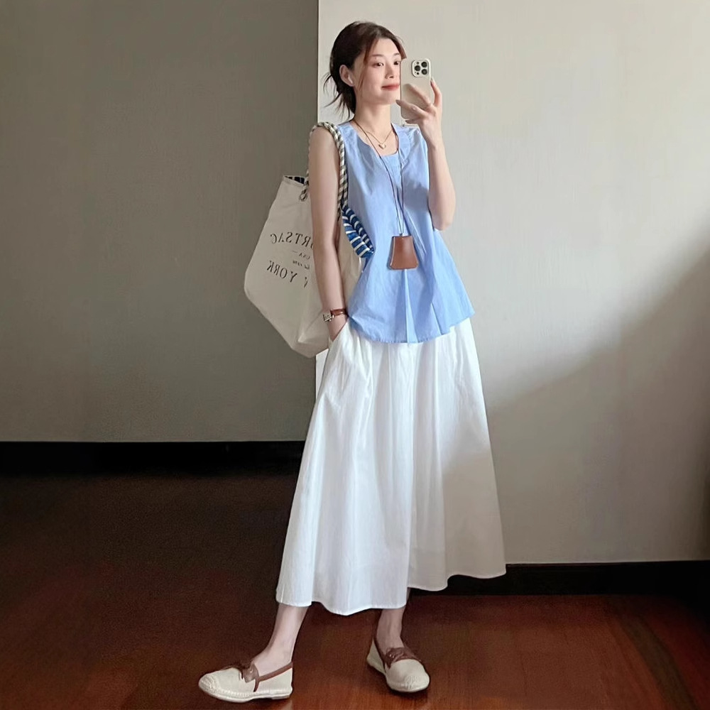 韓国の優しいスタイルの女性用夏スーツ、スイートブルーのノースリーブベストトップ、ハイウエストスカートの2点セット