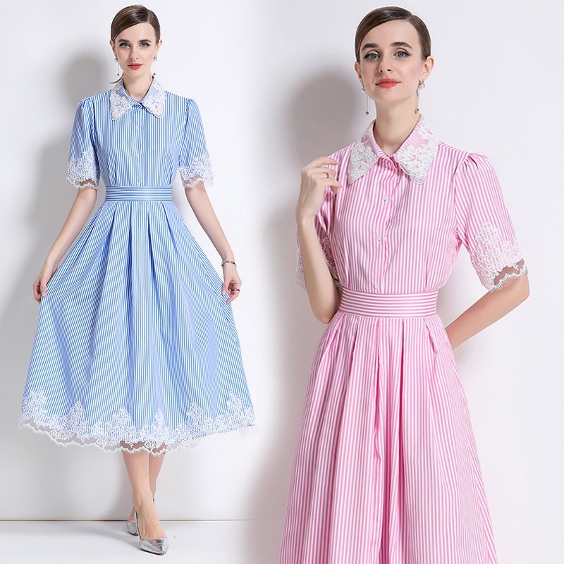 ブルーデザインレース半袖ストライプシャツスーツレディース夏プリーツAラインスカート2点セット