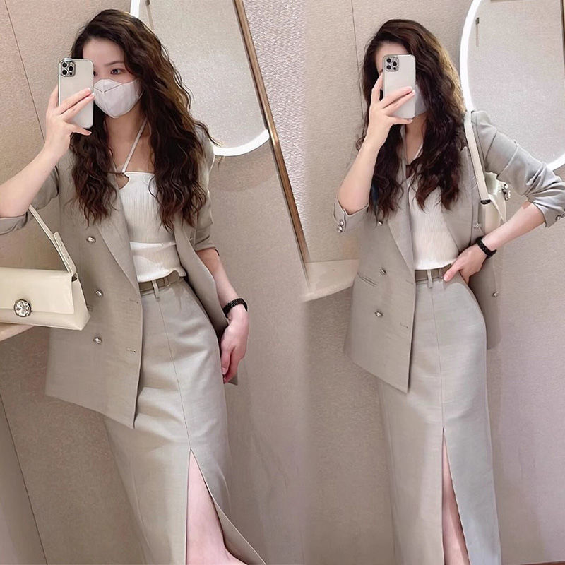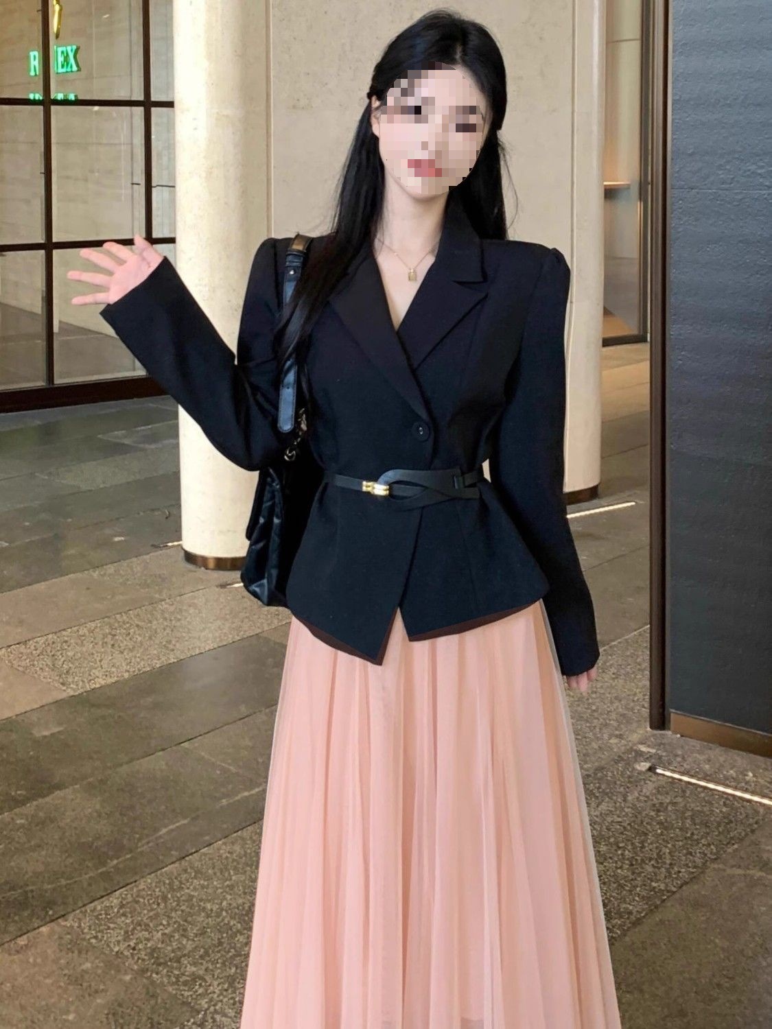 ソルト系、軽やかで大人っぽい、女神風、新作、職場ブラックコート、ガーゼスカート、ツーピーススーツ、春秋スタイル