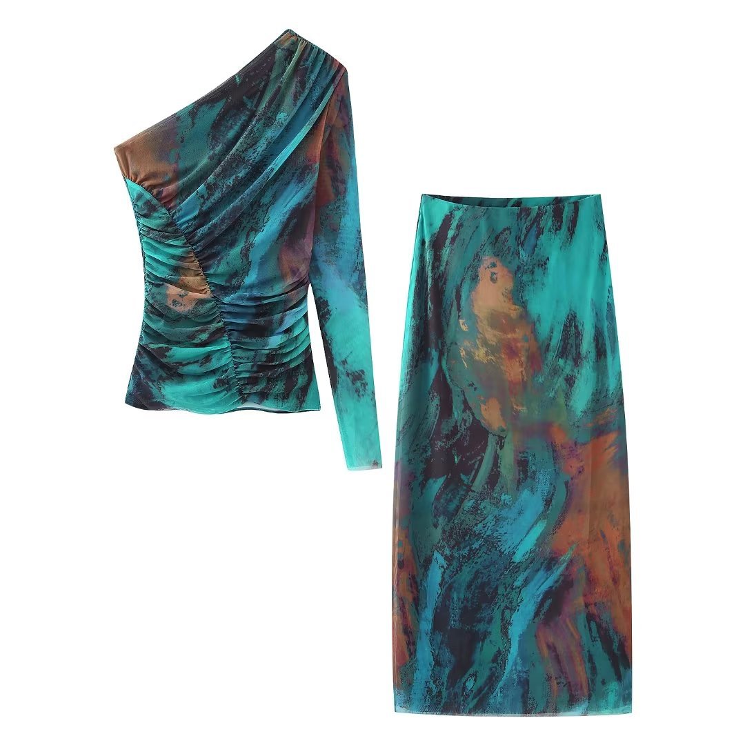 欧米2023新型婦人服秋絹網プリント上着 + プリント絹網スカートセットNN8-71458