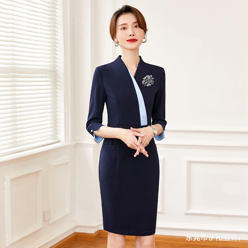 プロのワンピース女性の秋のファッションの気質は腰を収めてやせているホテルを現して客を迎えて服装の美容院の作業服を接待します。