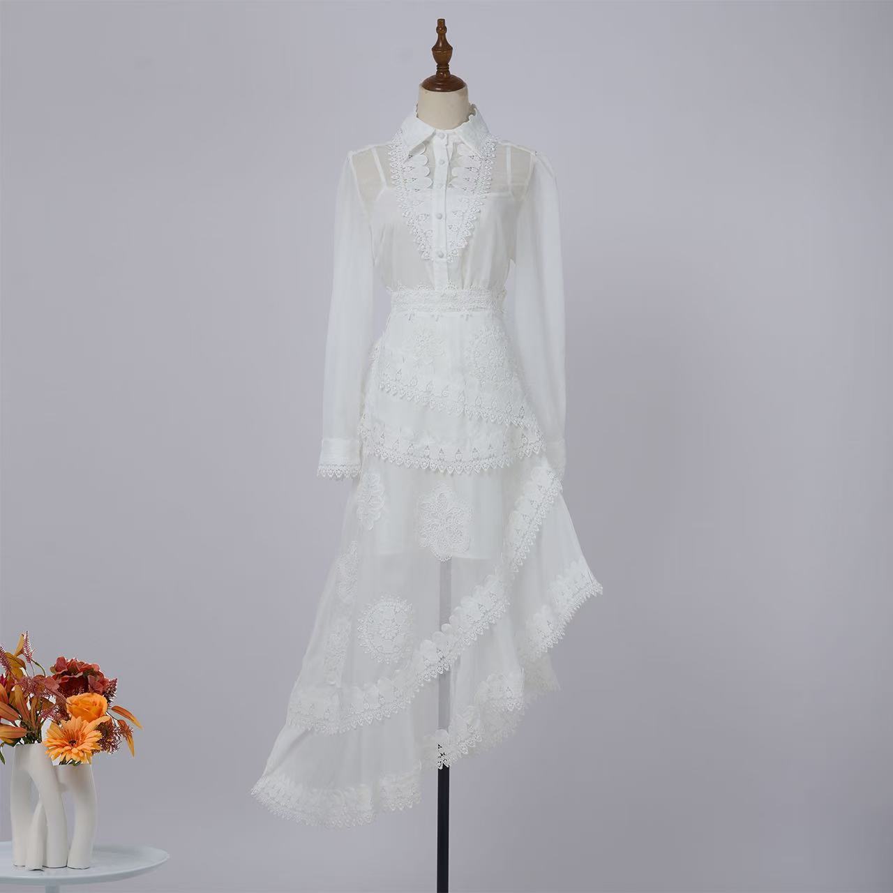 2024秋の新型の軽くて豪華な白いレースのシャツの透かし彫りの魚の尾の不規則な半身のスカートのスーツ