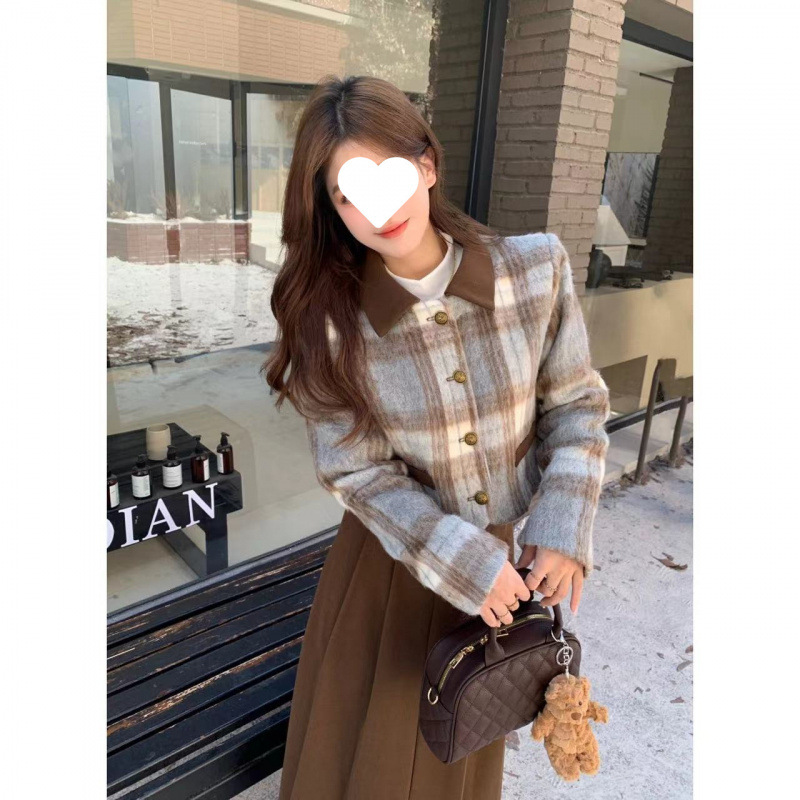AD初秋の2点セットのデザイン感のあるスーツのコートの女性グレーの格子縞2024の新型韓国版社長はスカートを着ています。