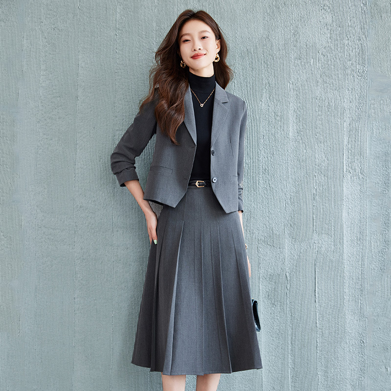 灰色のカジュアルスーツの女性の小さい子供の春秋の短いスーツの気質の通勤の半身のスカートの面接の職業の服