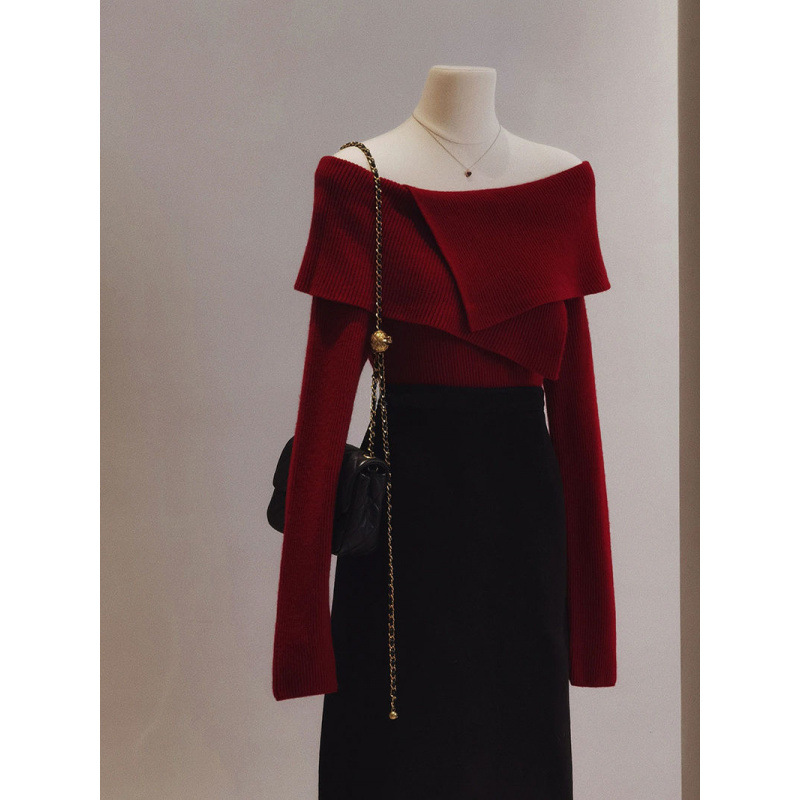 2025年の正月気質セクシーな肩を着て、正月の赤いセーターのスカートを2セット着ています