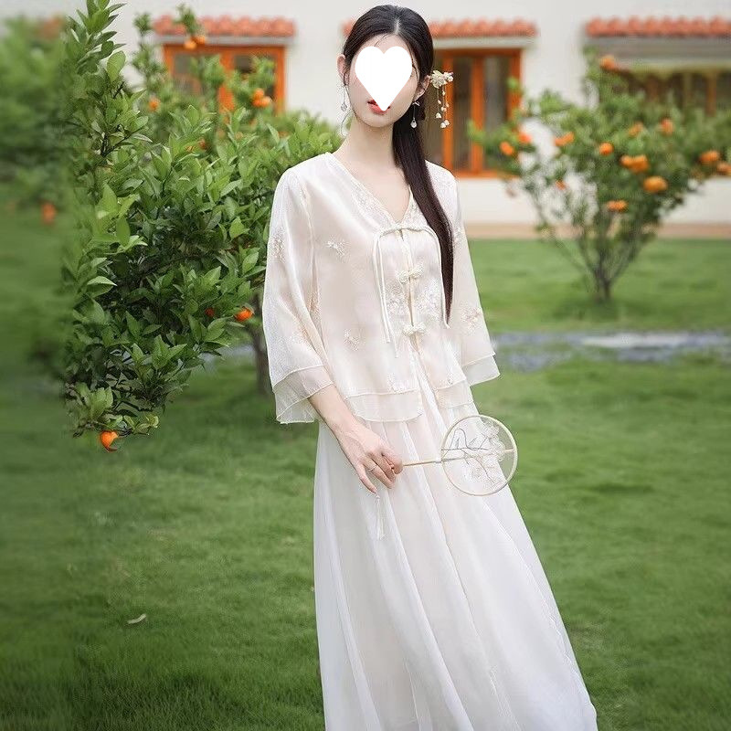 Xiaoqiの新しい中国風の女性の夏の新しいスタイルのハイエンド刺繍ボタントップスとスカート改良された漢服の2点セット