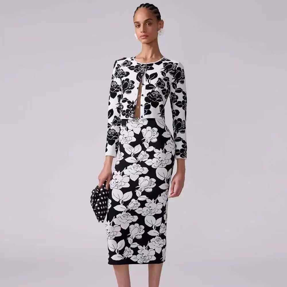 ヨーロッパとアメリカの新しいキャットウォーク包帯ニットスーツ黒プリントショートトップヒップカバースカートツーピースセットエレガントな気質