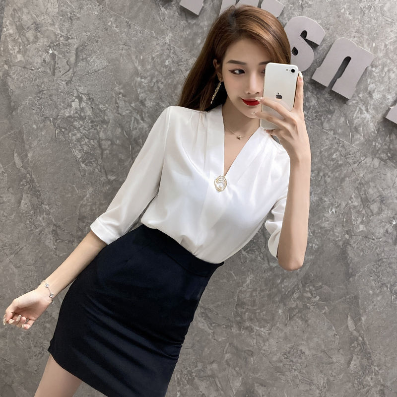 高級社交界の女性の夏のアセテートサテンスーツフロントデスクレセプションミッドスリーブVネックシャツスカート