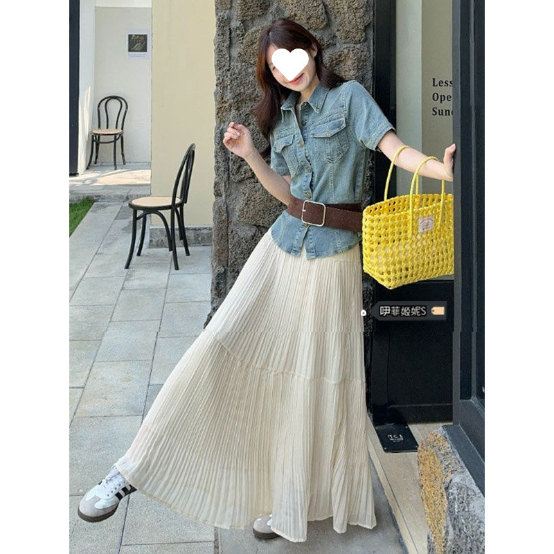 甘いスタイルの女性用半袖デニムシャツスーツ、夏のハイウエストドレーププリーツハーフレングススカート、レトロな右肩トップ