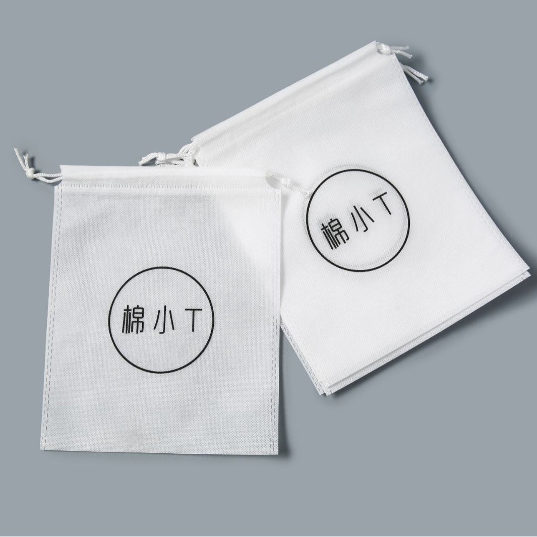 シンプルな白い不織布バッグ、ダブル巾着ポケット、テキストパターンを追加でき、自宅や旅行に便利な包装