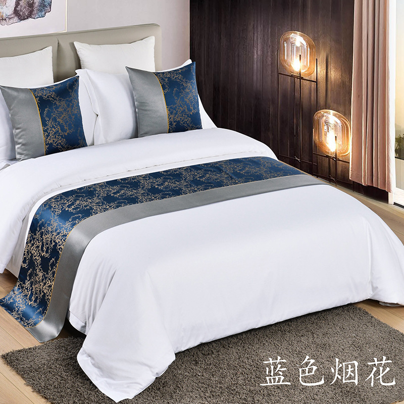 軽くて豪華な風のテーマのホテルのベッドの旗のベッドの尾のタオルの青い色の簡単なホテルの布の草はタオルを掛けて卸売りしますbedrunner