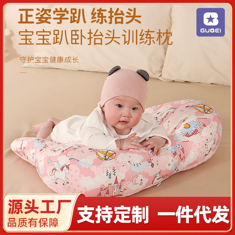 赤ちゃんがうつ伏せになって枕を上げてトレーニングします。