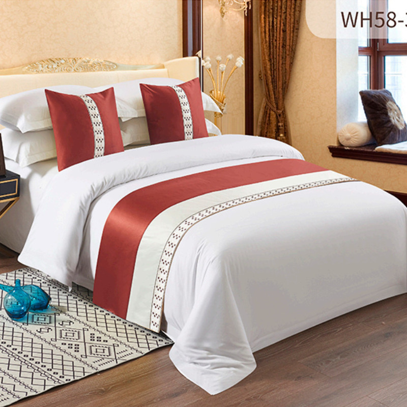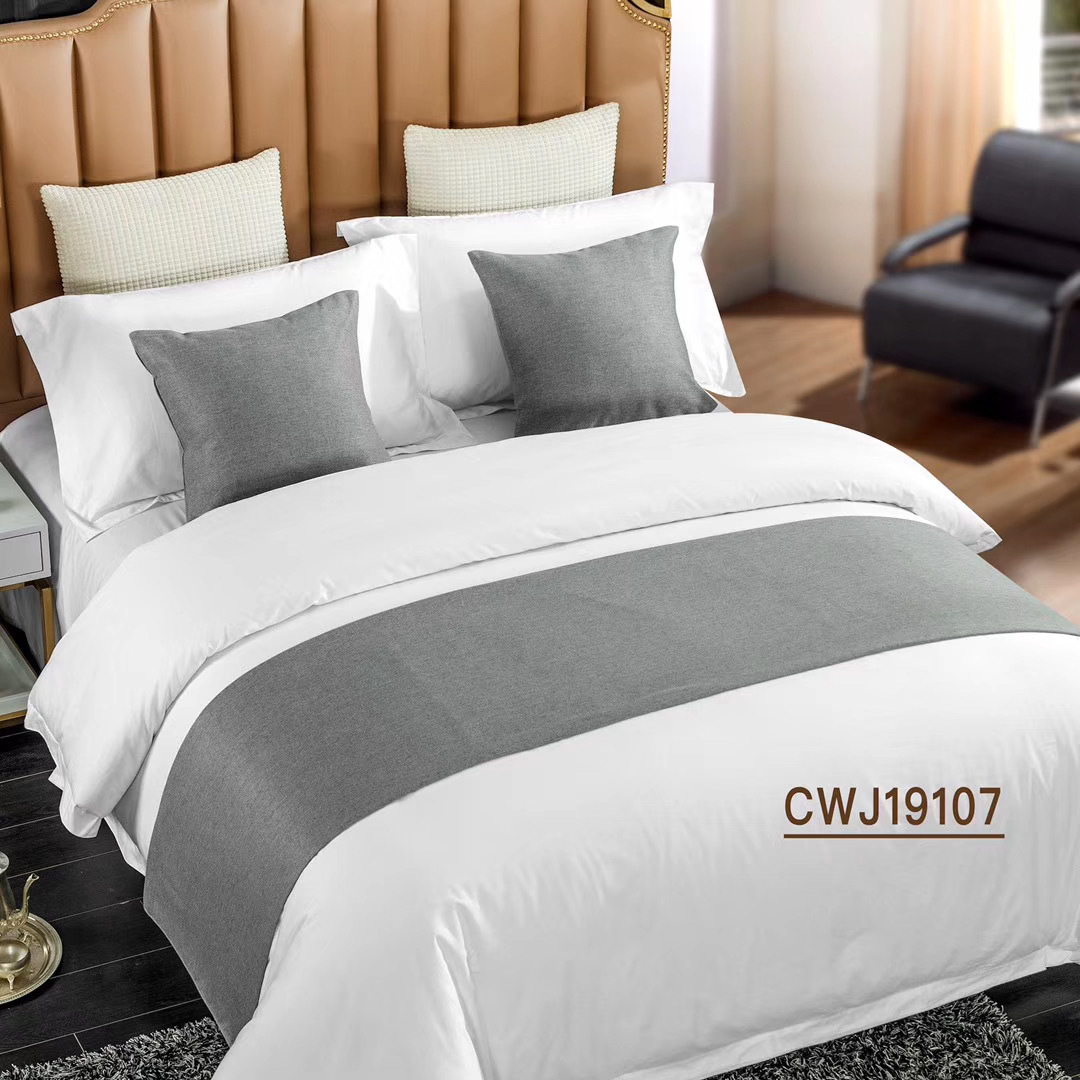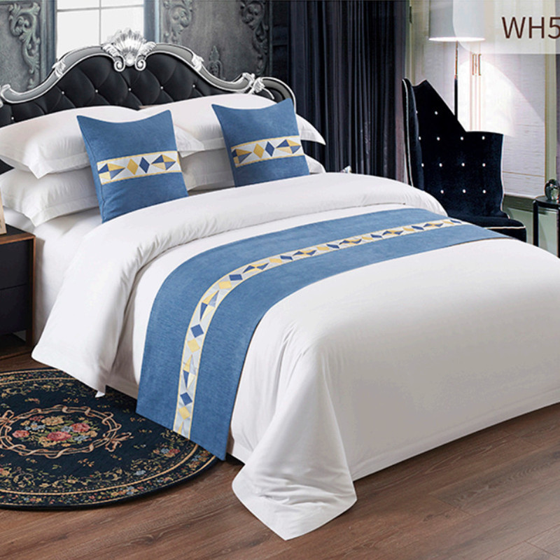 ホテルの高級なベッドの後ろのタオルのベッドの旗の色合わせのベッドの蓋の綿麻の民宿のベッドの用品のセットのメーカーはホテルのベッドの装飾を卸売りします。