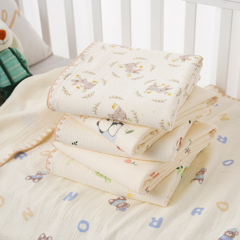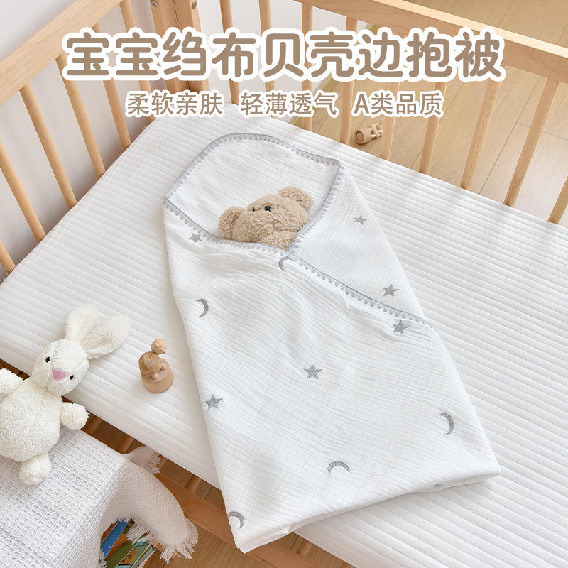 卸売四層クレープ生地ベビー用おくるみ、貝殻縁ガーゼ子供用小布団、柔らかく通気性のあるベビー用ブランケット