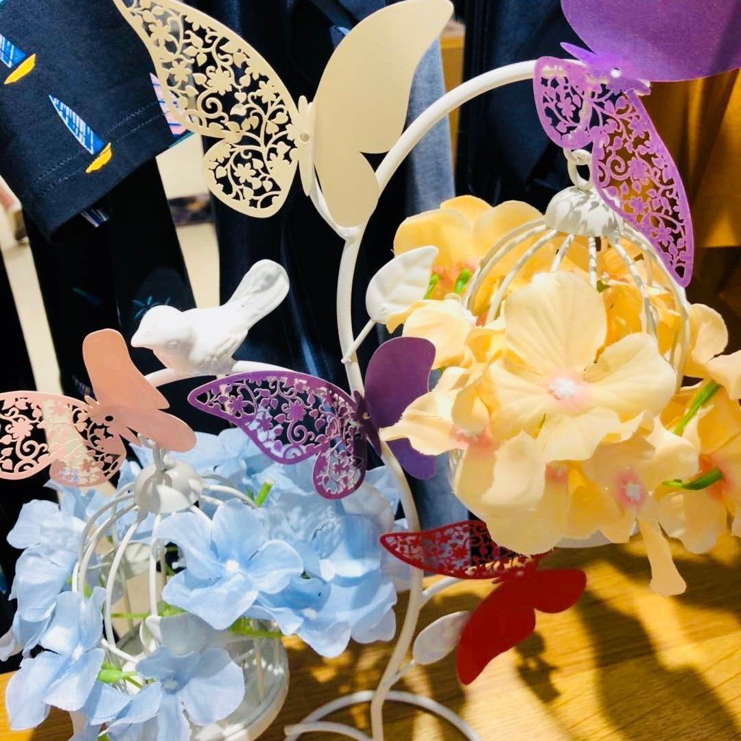 アマゾンの花を売って宴会の結婚式を飾って立体の杯のカードの濃い紫色の蝶の壁を飾って席のカードの現物を貼ります。