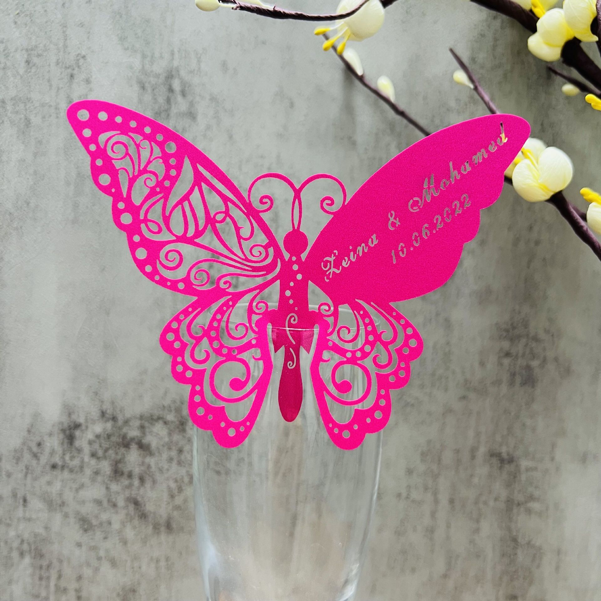 ヨーロッパ式の杯のカードは結婚の酒席の席カードの美しい蝶の名前のカードのレーザーの透かし彫りのカードの卸売りを挿します。