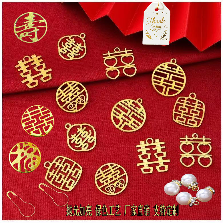 喜字ペンダント、小さな金属製アクセサリー、ギフトボックス用吊り下げ飾り、ミニジュエリー装飾、中国風金色丸型小型ダブル喜(シ)