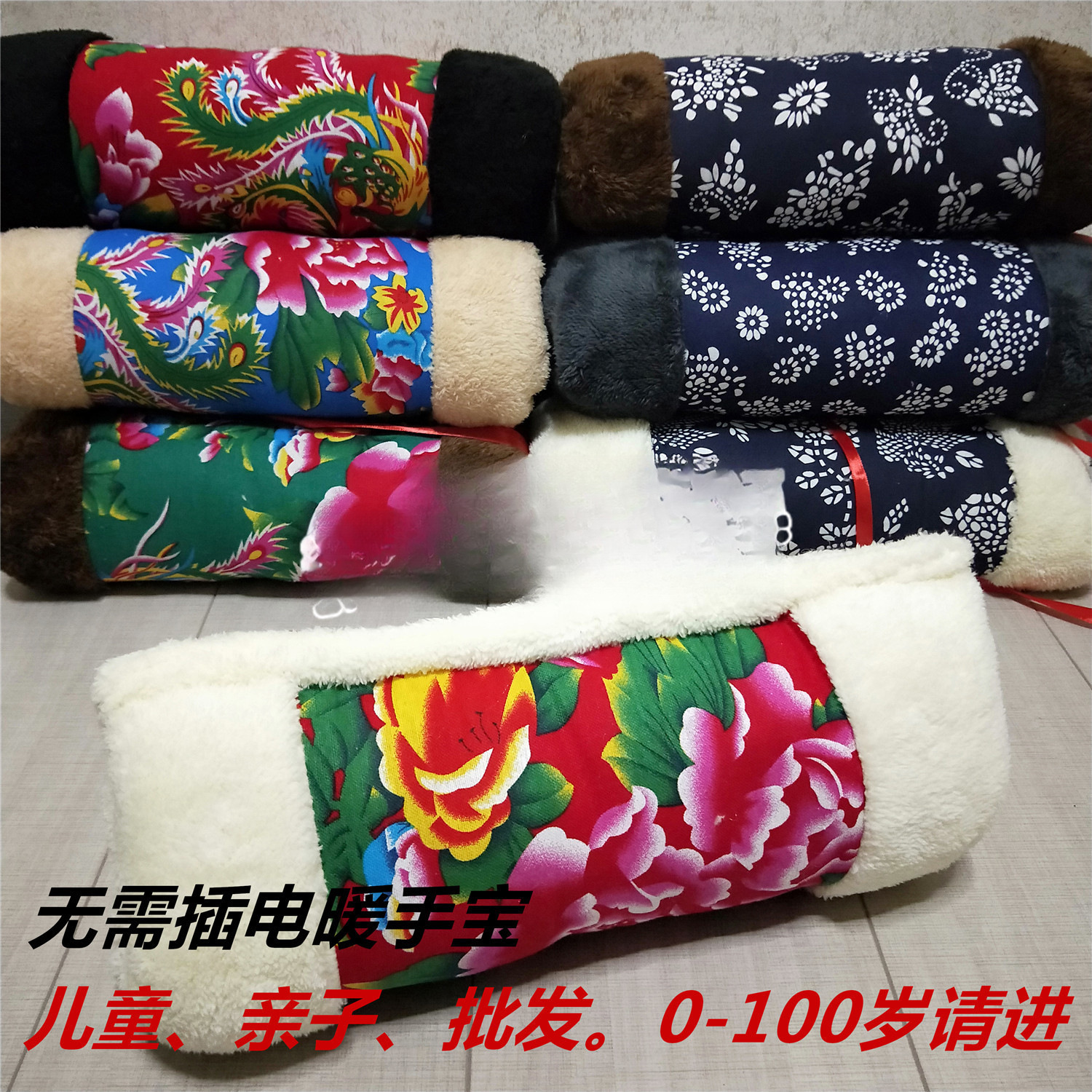 ハンドウォーマー、冬用暖かい漢服、サテン綿、コーラルベルベット、中高年、富、長寿、プラグなし
