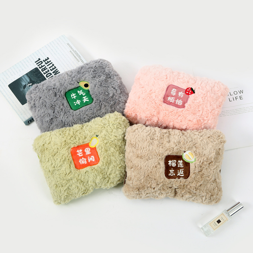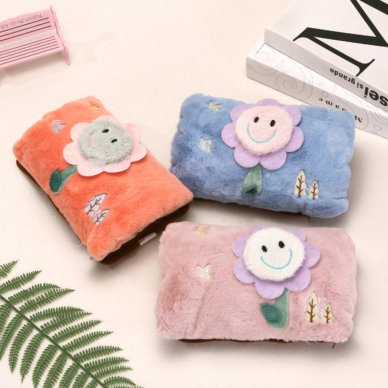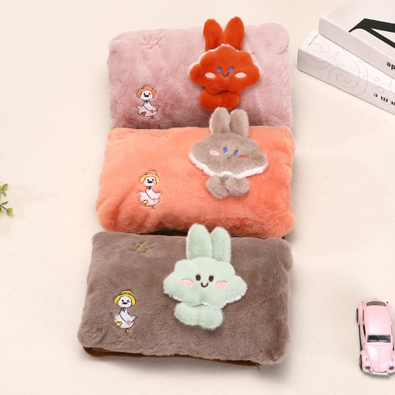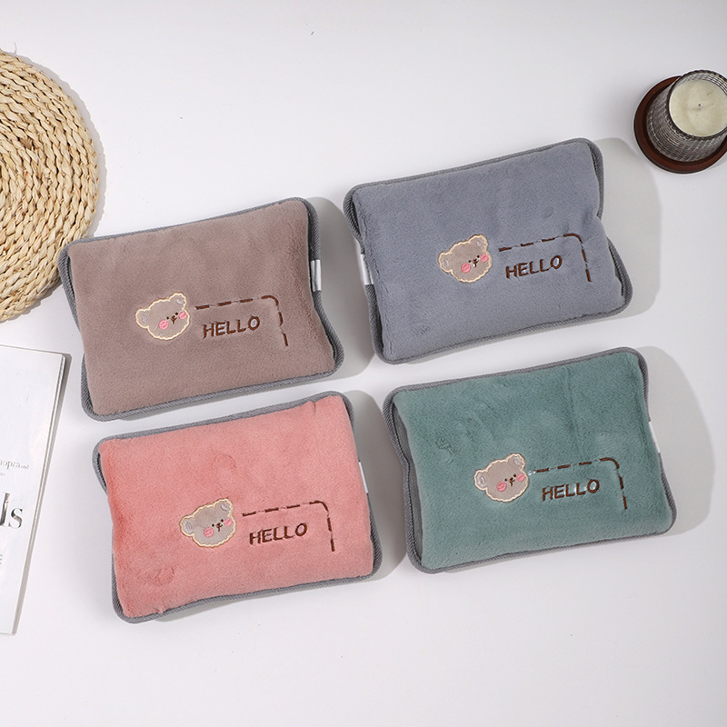 新しい充電湯たんぽを郵送します。かわいいアニメの湯たんぽに手を入れます。